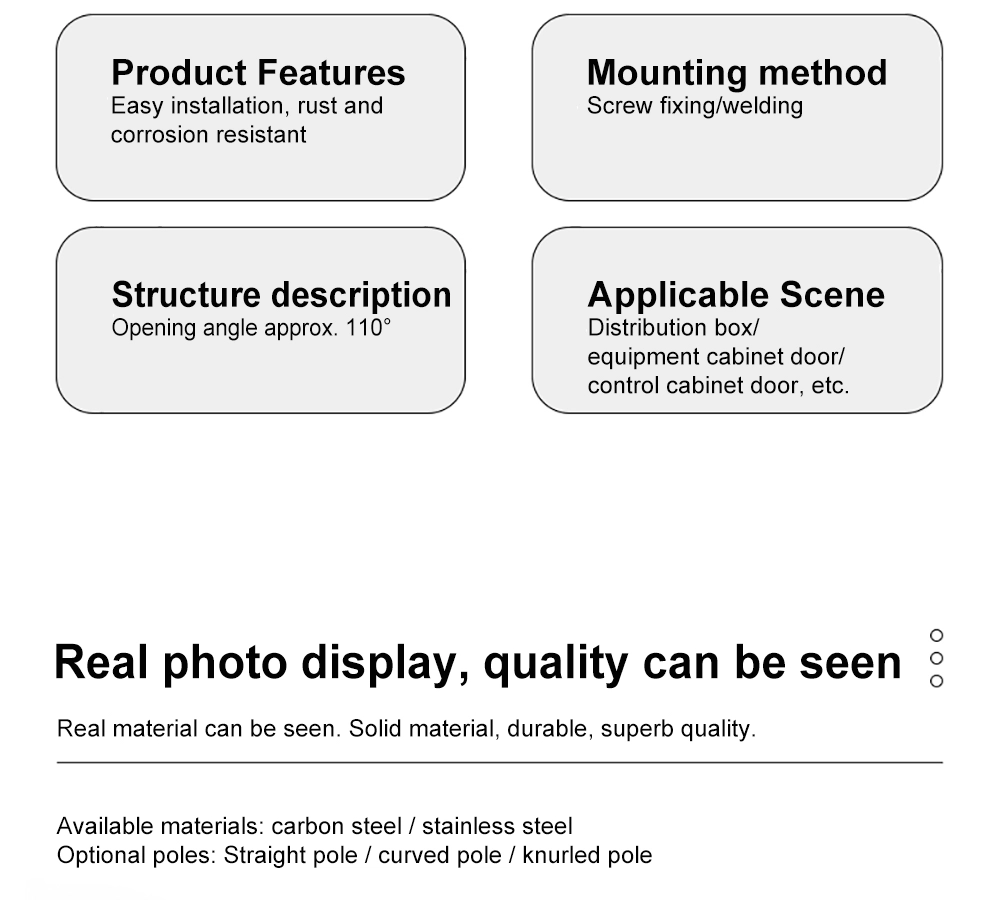 Yitai لاک کے پاس صنعتی کابینہ کے منصوبوں کے لیے ڈسٹری بیوشن بورڈ سوئول ہینج اسٹاک میں ہے۔ 110° تک کے افتتاحی زاویے کے ساتھ، CL248 ڈسٹری بیوشن بورڈ سوئول ہینج وائرنگ، معائنہ اور دیکھ بھال کے لیے کافی جگہ فراہم کرتا ہے۔ یہ کابینہ کی ساخت کی بنیاد پر پیچ یا ویلڈنگ کے ذریعے طے کیا جا سکتا ہے۔ اختیاری سیدھی چھڑی، جھکی ہوئی چھڑی، یا گرے ہوئے چھڑی کے ساتھ، ڈسٹری بیوشن بورڈ کنڈا قبضہ مختلف دروازے کے فریم لے آؤٹ اور اسمبلی کے طریقوں کے مطابق ہوتا ہے۔