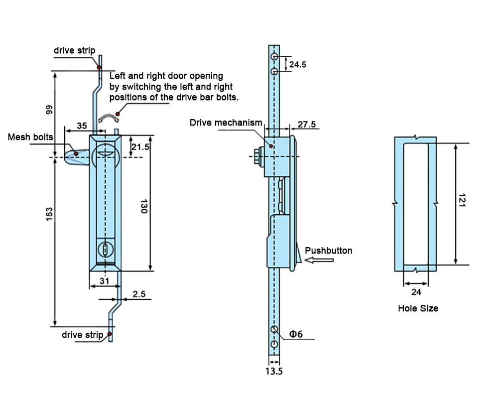 استحکام اور سنکنرن مزاحمت کے ل the سٹینلیس سٹیل کے دروازے کا تالا اصل سٹینلیس سٹیل کے رنگ میں سٹینلیس سٹیل سے بنا ہے۔ افتتاحی سائز 24 ملی میٹر × 121 ملی میٹر ہے ، جو معیاری تنصیب کی تشکیل کے ساتھ مطابقت کو یقینی بناتا ہے۔